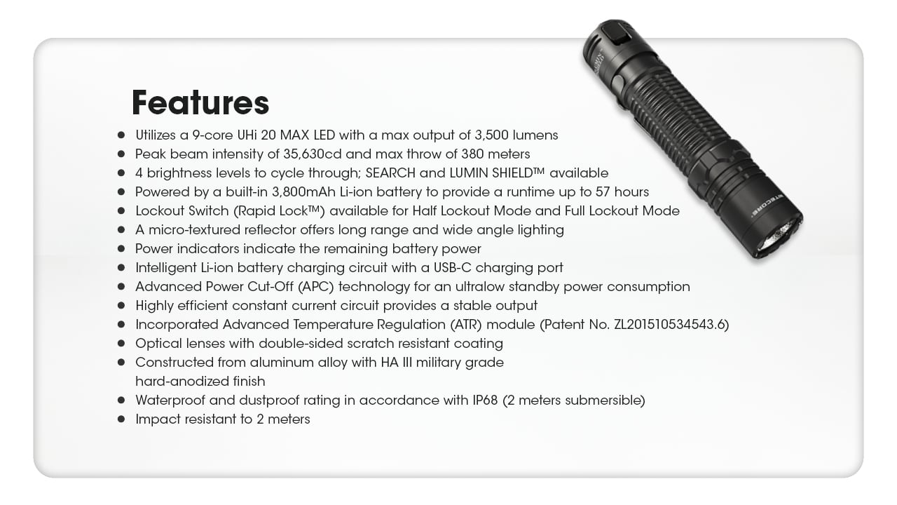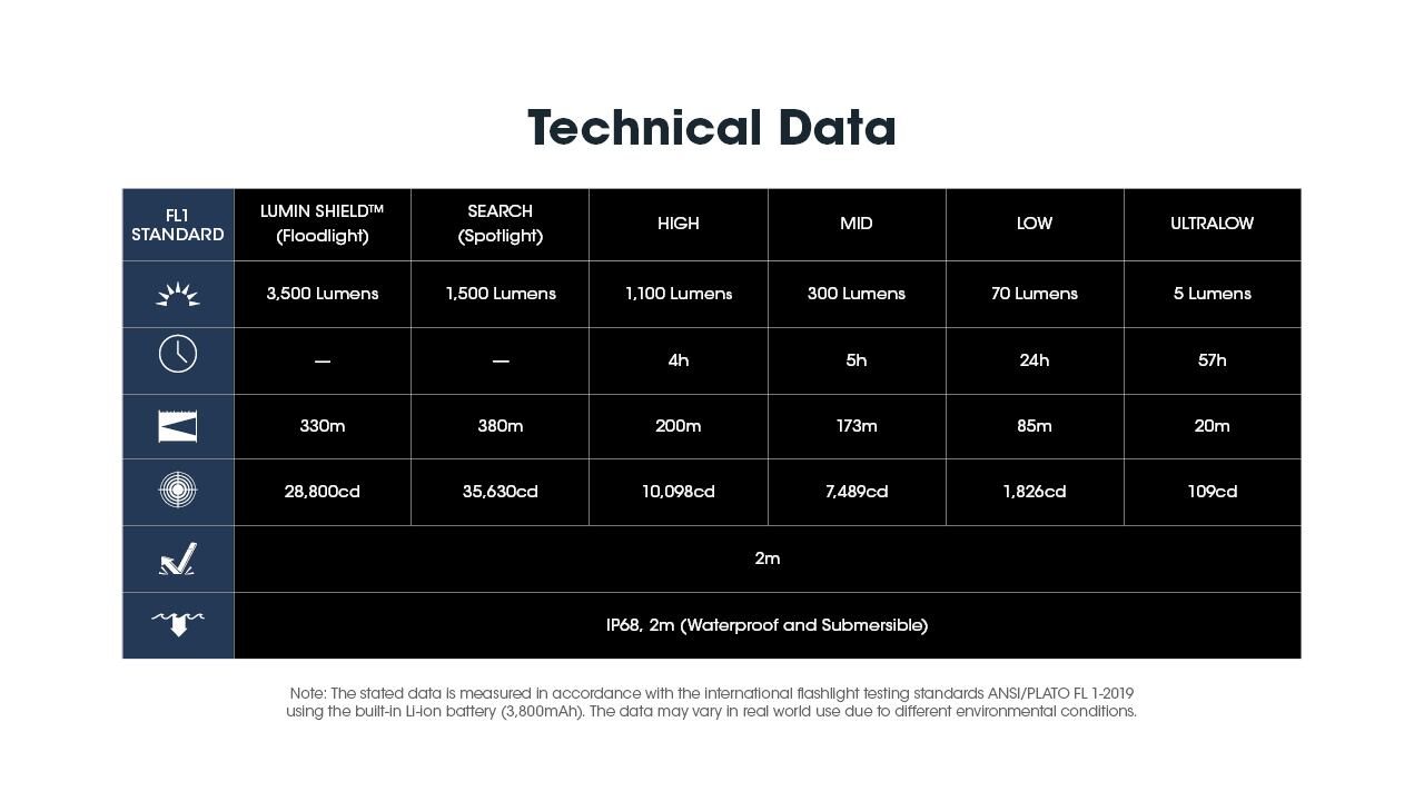 ポケットサイズに収まるコンパクトボディに、最大3500ルーメンの圧倒的出力を搭載。